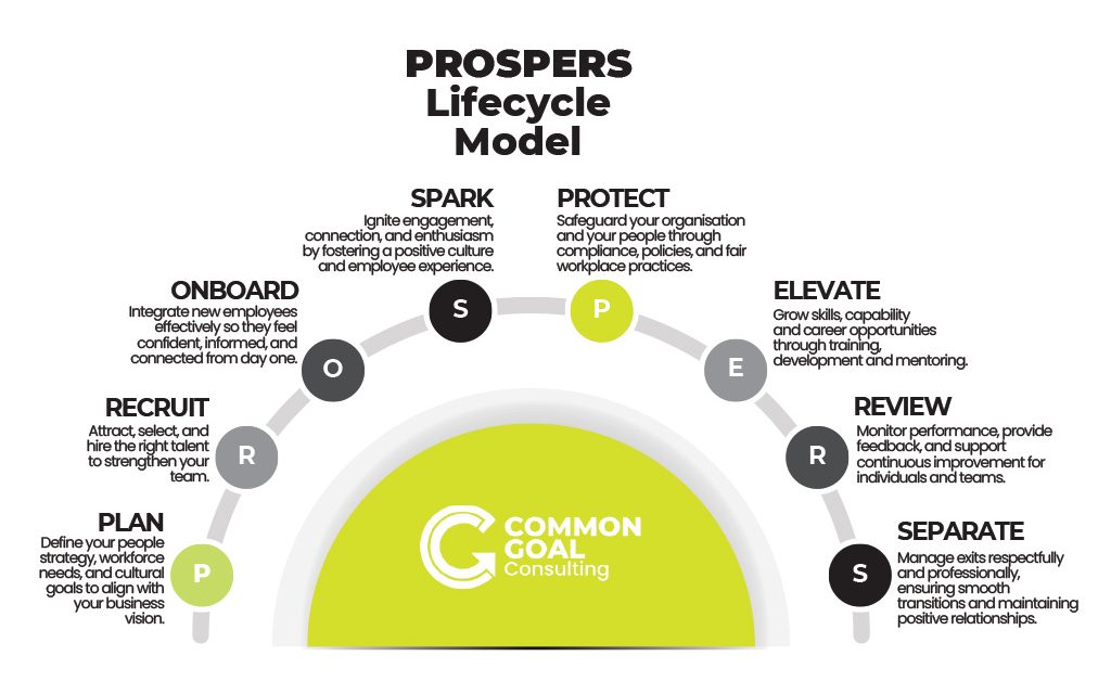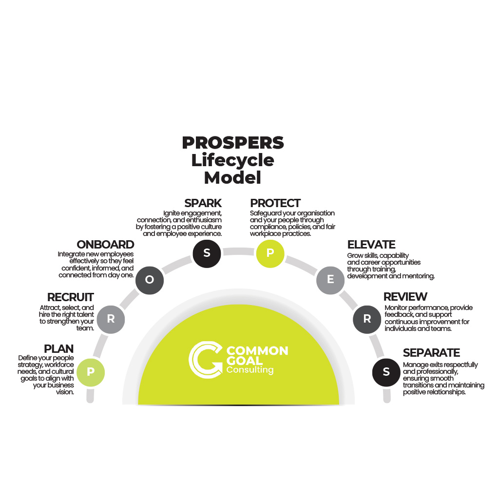 That’s why we use our PROSPERS Lifecycle Model – a simple, structured framework that guides you through every stage of the employee experience, ensuring nothing important is overlooked.